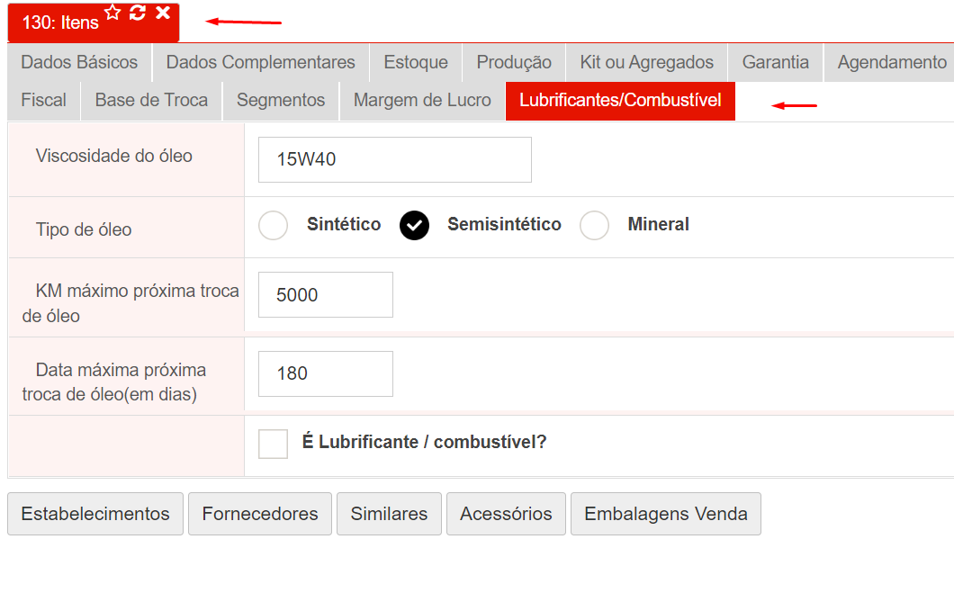Para isso acesse a rotina R130 clique em Alterar o item de Óleo desejado e navegue até aba Lubrificantes/Combustível.