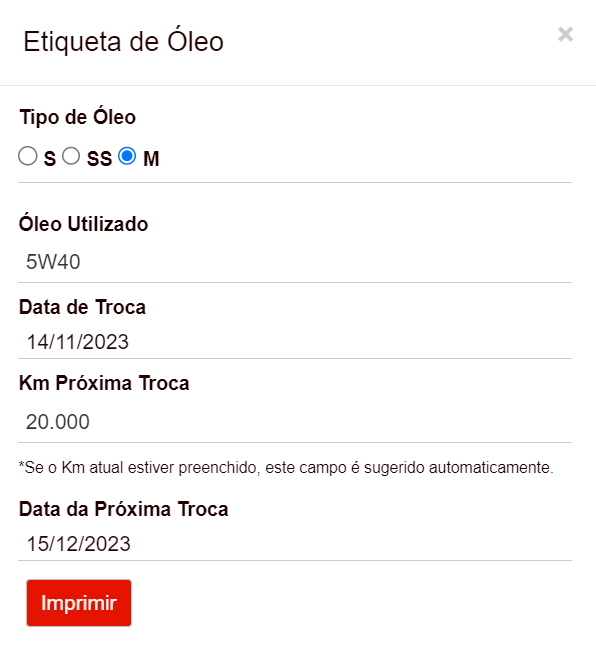 Clicando sob o ícone será aberto a tela [Etiqueta de Óleo] para conferencia dos dados a serem impressos e também para Imprimir a etiqueta, caso existe um item devidamente configurado na [R130 - Itens ] conforme citado anteriormente nesta base de conhecimento será sugerido as informações já preenchidas.