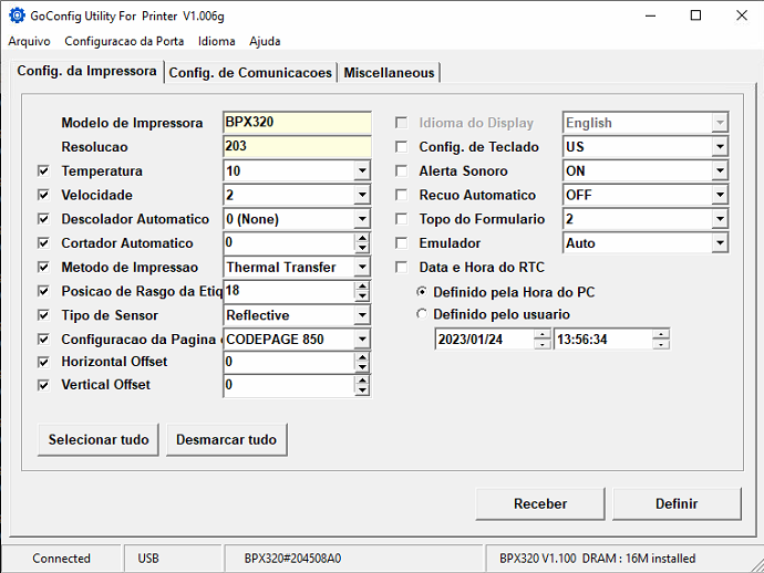 A configuração da etiquetadora durante a homologação tivemos as seguintes definições: