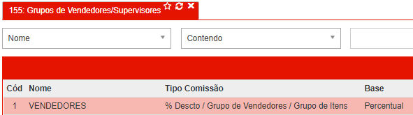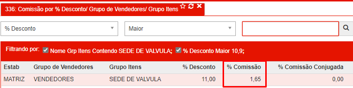 Para a demonstração vamos utilizar as configurações de comissionamento da [R336 - Comissão por % Desconto/ Grupo de Vendedores/ Grupo Itens].