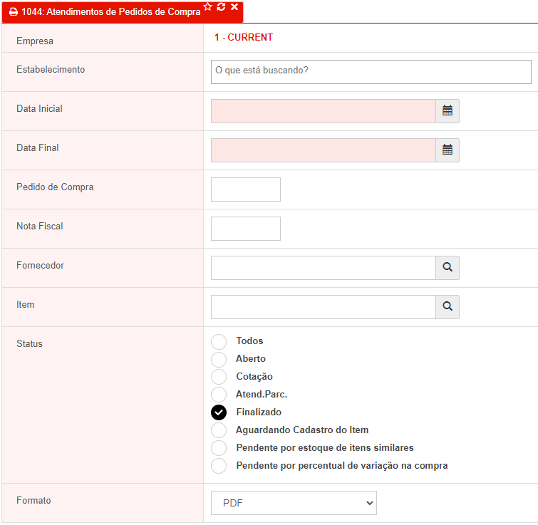 A rotina fornece um relatório para análise dos pedidos de compra realizados durante um período, com filtros de estabelecimento, pedido de compra, nota fiscal, fornecedor, item e status do pedido.