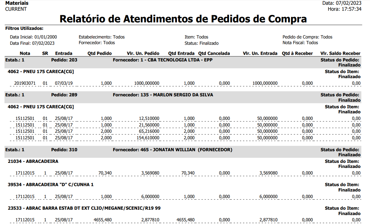 O relatório apresenta os pedidos separados por cada item que o compõe, demonstrando a nota, série, data de entrada, quantidade do pedido, valor unitário do pedido, quantidade de entrada, quantidade cancelada, valor unitário da entrada, quantidade a receber e valor do saldo a receber. Além disso, tem o status do pedido e de cada item.