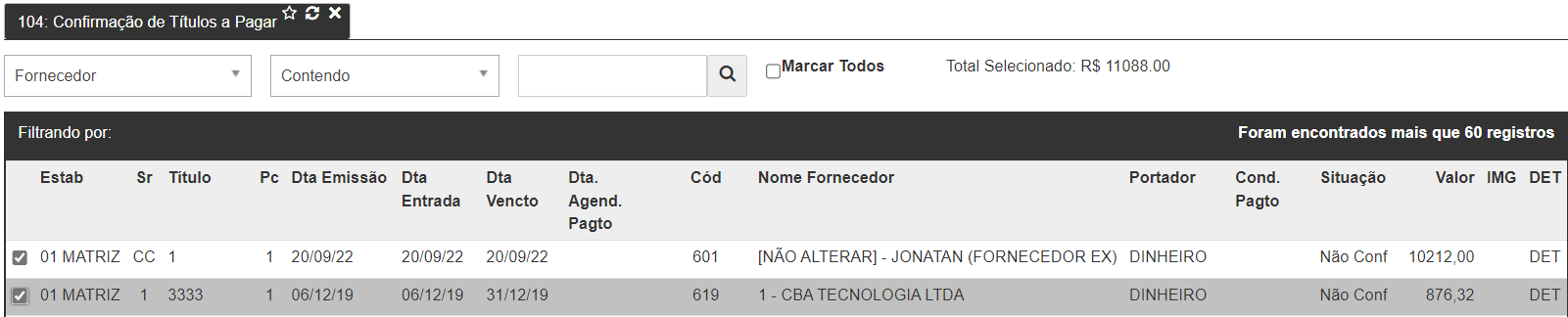 A partir da versão v4.598 do MOVERE, a rotina [R104 - Confirmação de Títulos a Pagar] foi adicionado um texto de totalização para os registros selecionados na grade de títulos.