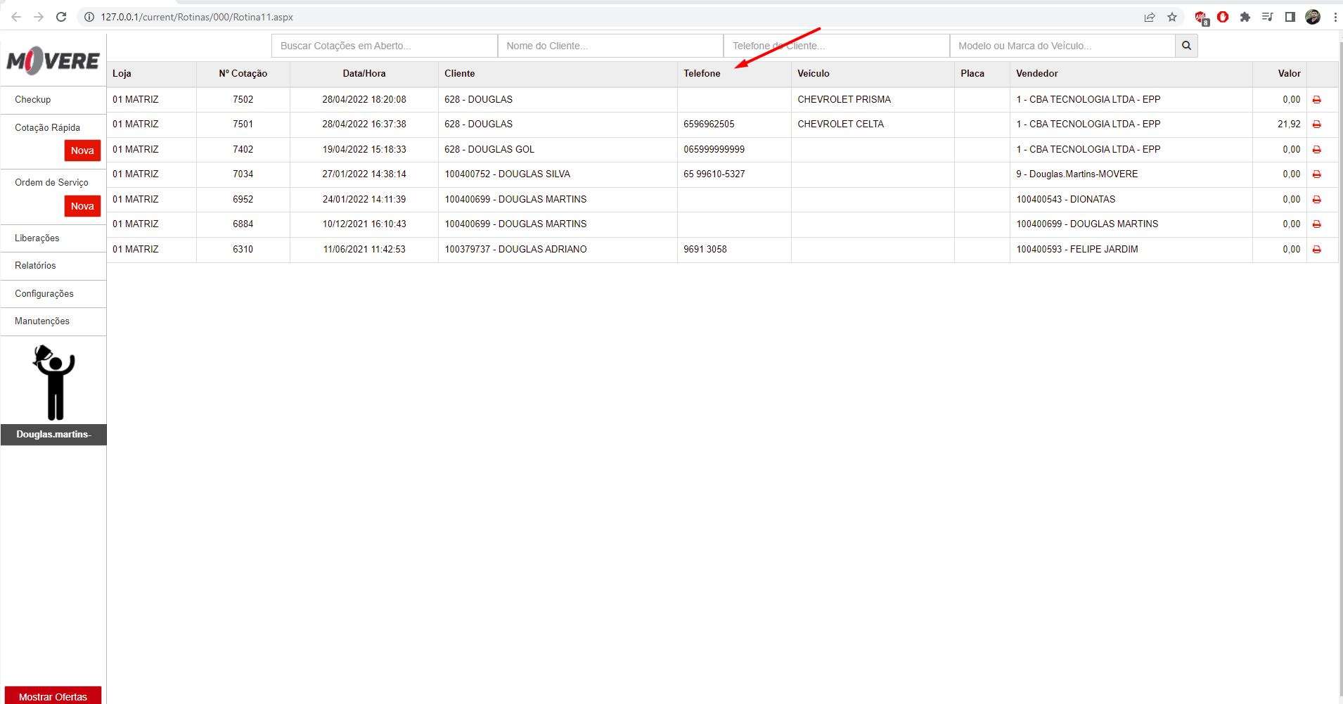 - "Telefone do Cliente": Esse modo de pesquisa utiliza o Telefone do cliente para buscar por cotações que tenham o mesmo Telefone fornecido, não é necessário digitar todo o número do telefone, se o usuário digitar apenas metade dos números o Movere buscará por telefones semelhantes ao número digitado, por ser uma busca especifica o resultado será processado mais rápido.