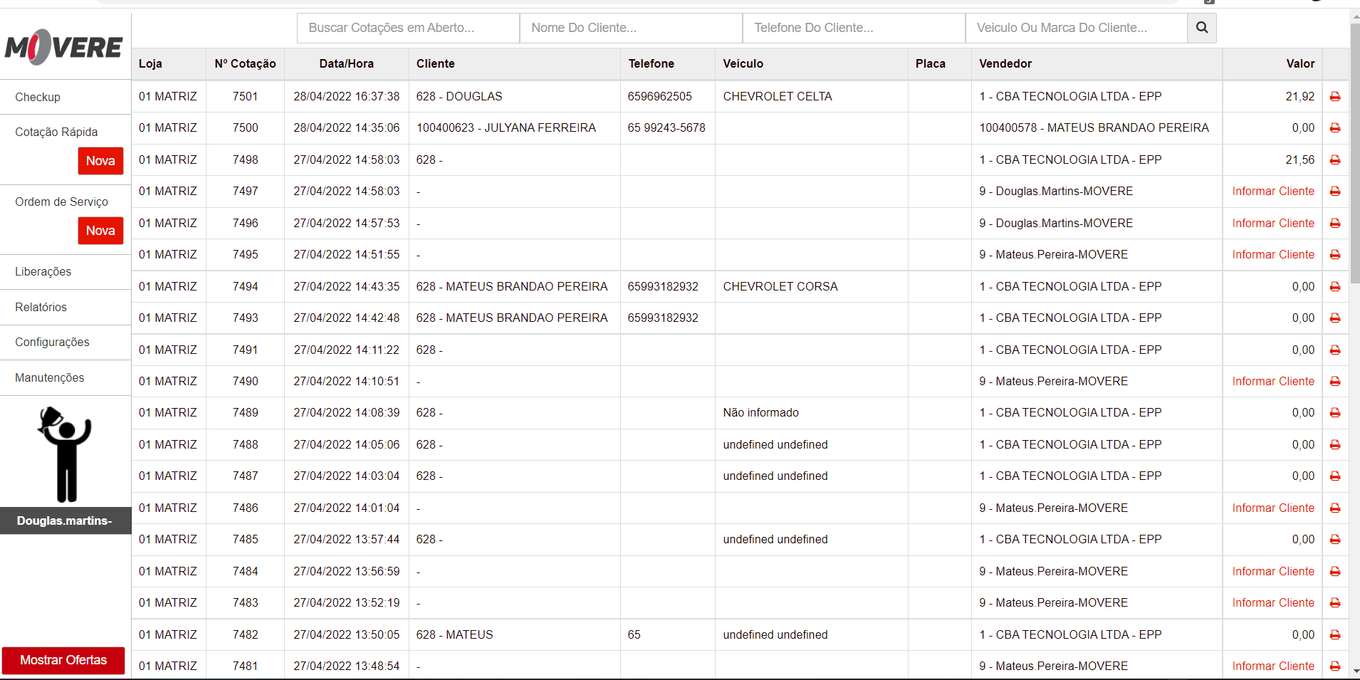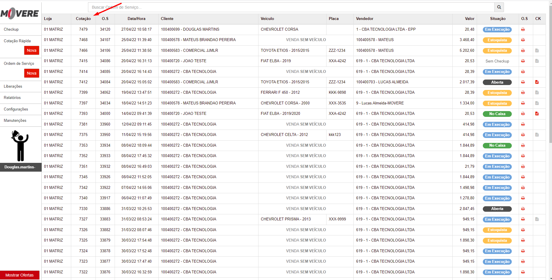 - "Buscar Cotações em Aberto": Esse modo de pesquisa mantem o padrão que já era utilizado, informando um termo será feita a busca por esse mesmo termo em cliente, vendedor, marca do veículo, modelo do veículo, telefone e placa.