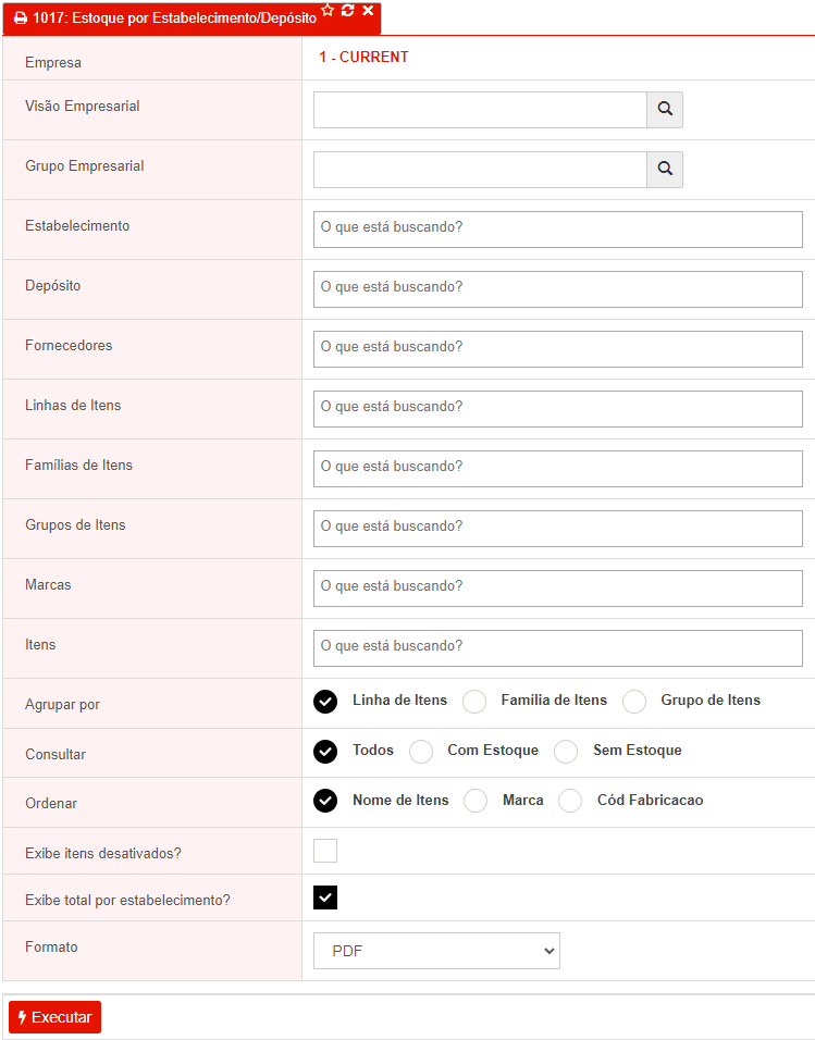 Este relatório visa trazer informações de estoque por estabelecimento por depósito assim como totais por estabelecimento, por itens e gerais.