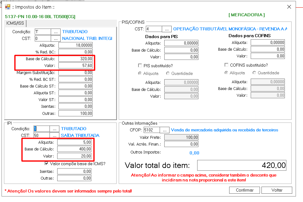 Em operações de emissão de notas com O Parâmetro [1323-Somar Valor de Frete na Base de Calculo de IPI] Ativo e há frete o sistema vão somar na base de Calculo de IPI o Valor do frete.