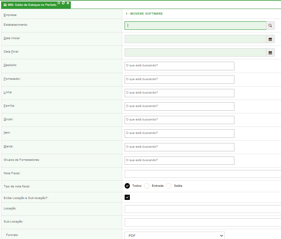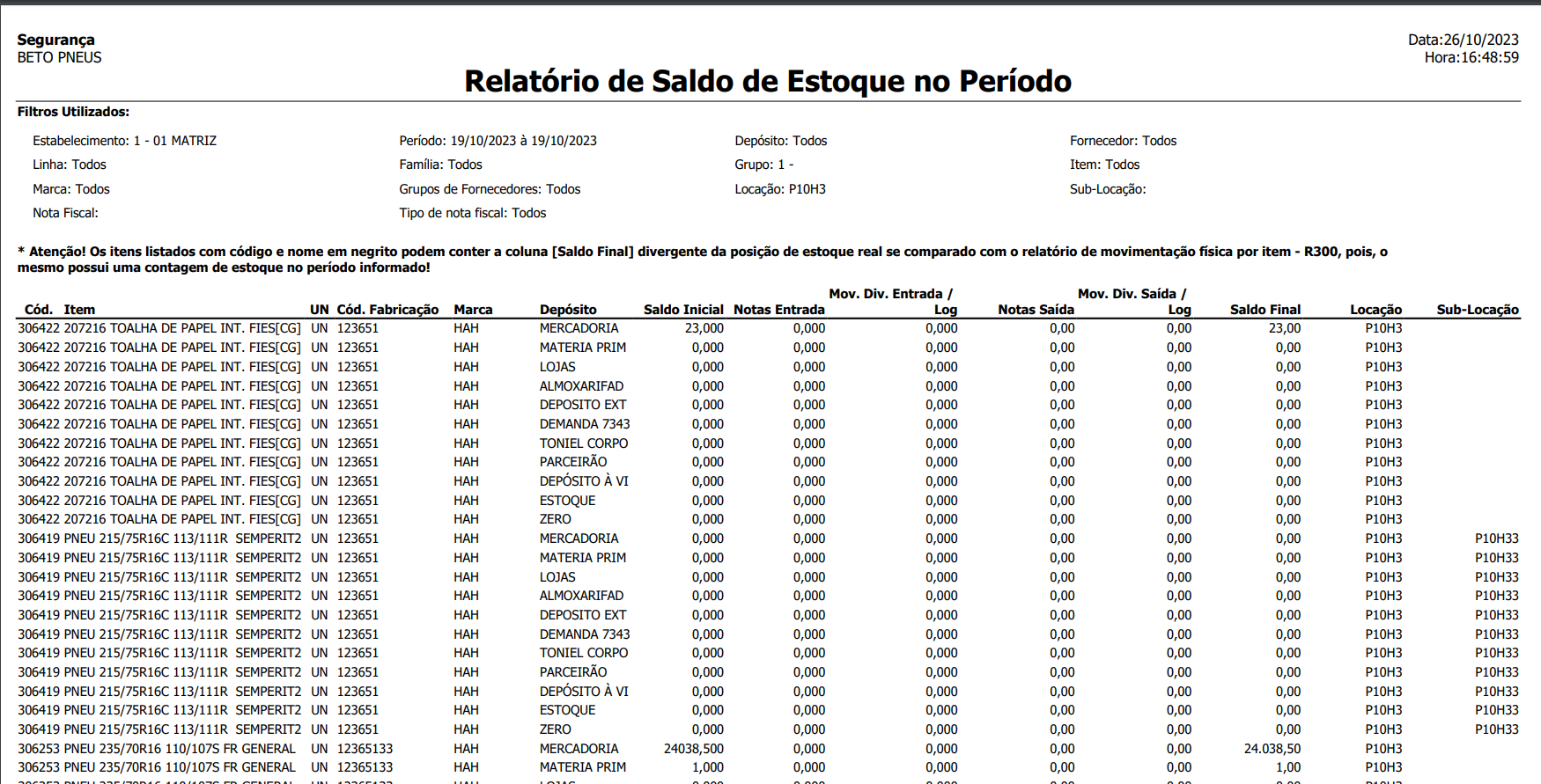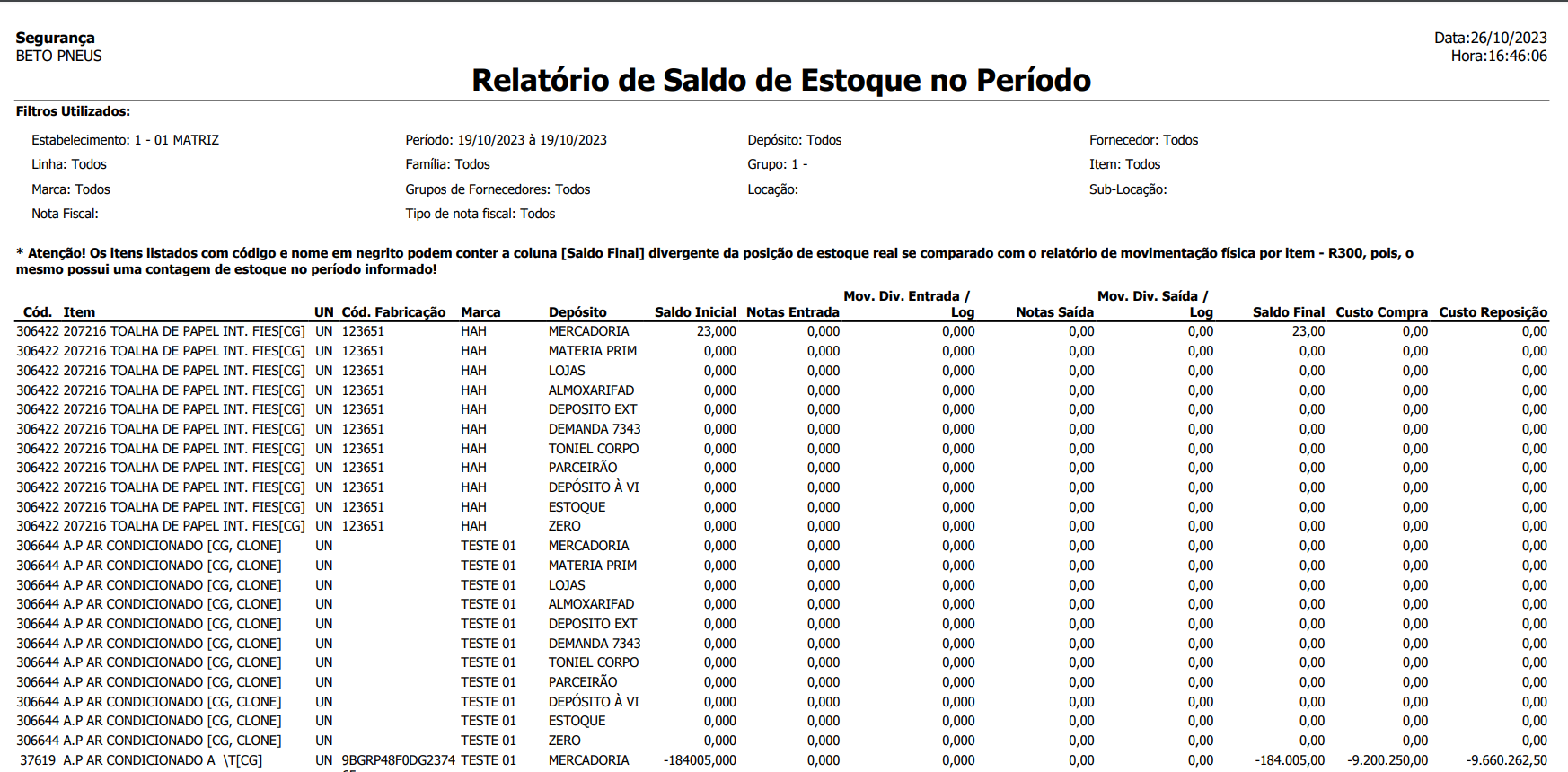 Este relatório visa demonstrar para os Estoquistas, Compradores e os Gestores da Empresa o saldo de Estoque por período.