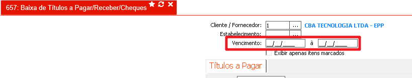 Este documento tem como objetivo exemplificar o uso do filtro [Vencimento] na [R657 - Baixa de Títulos a Pagar/Receber/Cheques].