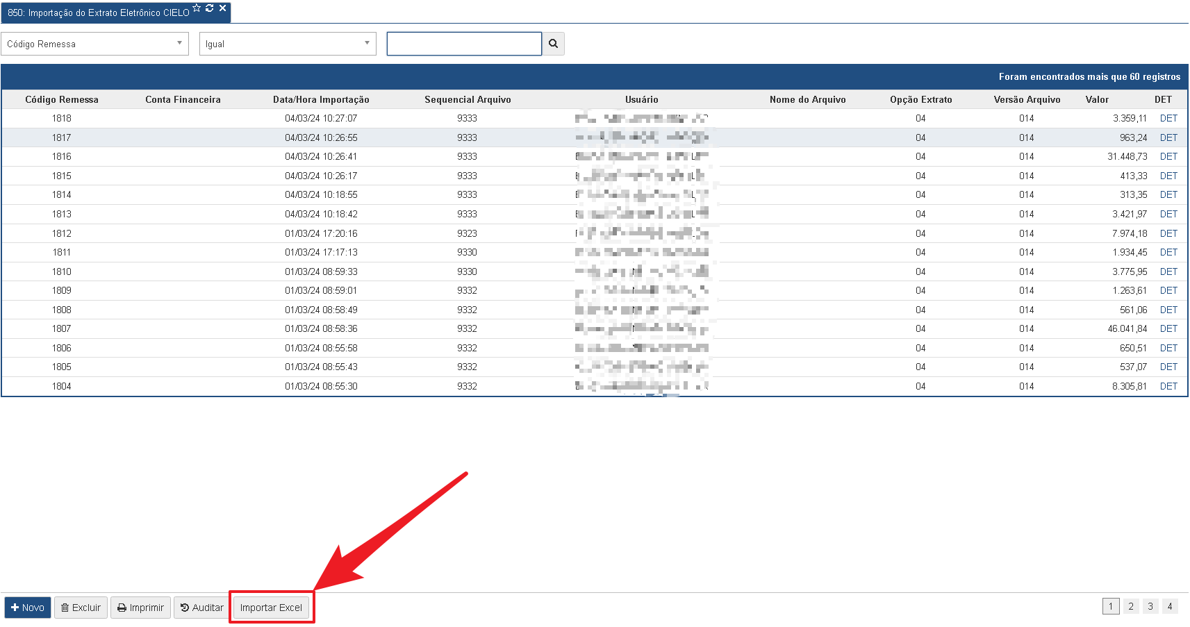 A partir da versão v4.621 do MOVERE, foi adicionado o direito Importar Excel a rotina [R850 - Importação do extrato eletrônico CIELO].