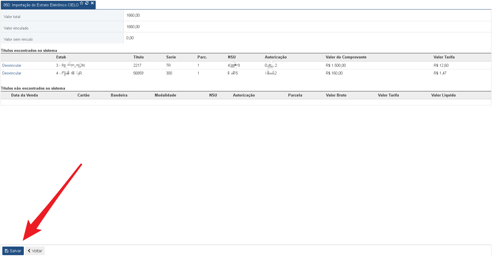 Caso seja necessário, realize o vínculo dos títulos não encontrados. Após isso clique em [Salvar].