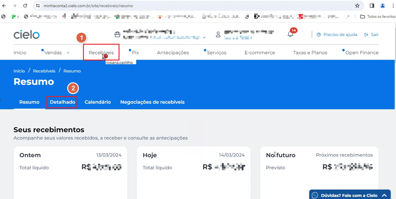 Logado no sistema da Cielo clique no menu Recebíveis, em seguida clique no menu Detalhado