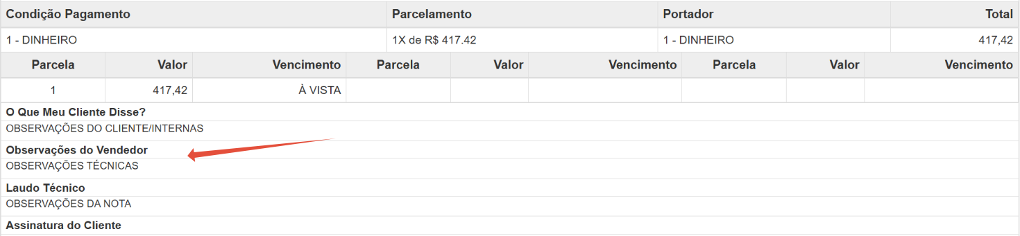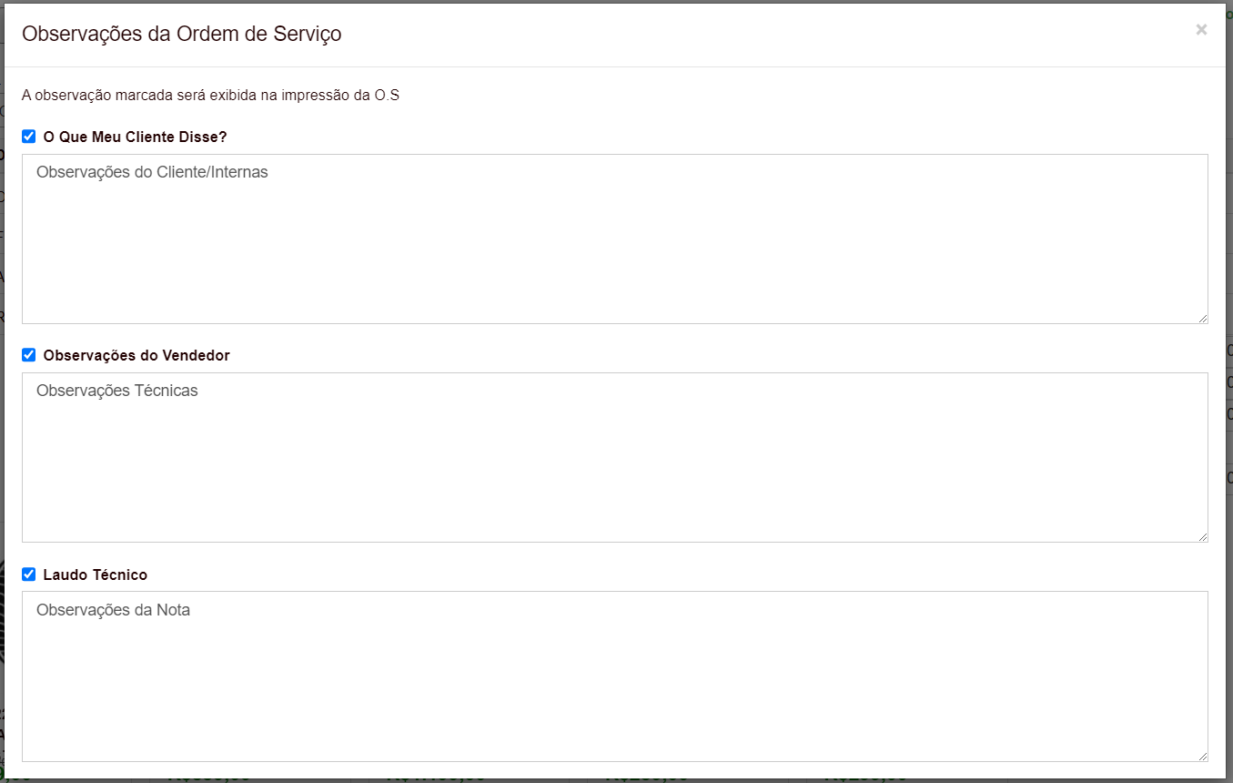 Vale ressaltar que, quando selecionada as outras opções que não sejam "Observações Cliente, Vendedor e Técnica", tanto na tela das observações da ordem de serviço quanto na exibição das observações nos relatórios, o nome das observações muda, como podemos ver abaixo: