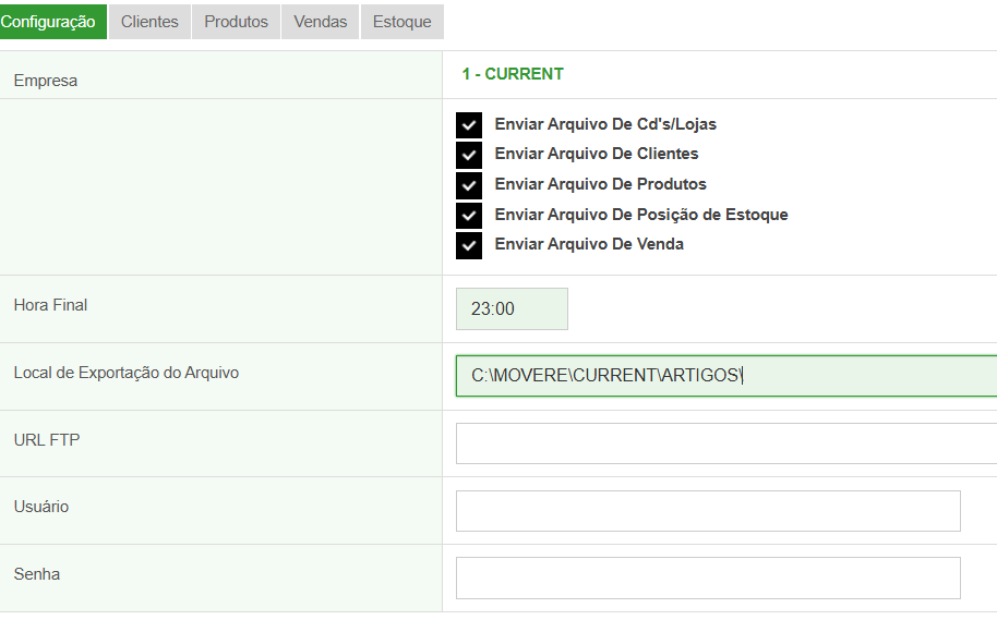 Para empresas com infraestrutura própria que desejam salvar arquivos em um caminho da rede interna, basta preencher o campo de local de exportação e deixar os dados de FTP em branco.