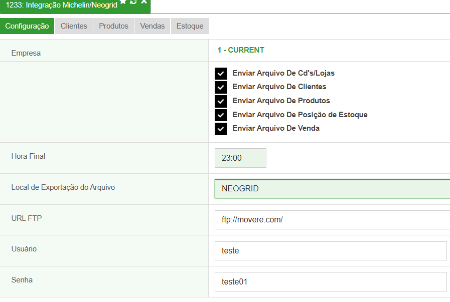 Nesse exemplo temos a configuração para envio automáticos dos arquivos através do FTP