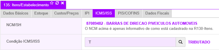 - Na R135 (Itens por Estabelecimento), na aba ICMS/ISS, a tributação do item deve estar corretamente configurada.