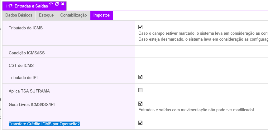 - Na aba Impostos, a opção "Transfere Crédito ICMS por Operação?" deve estar marcada.