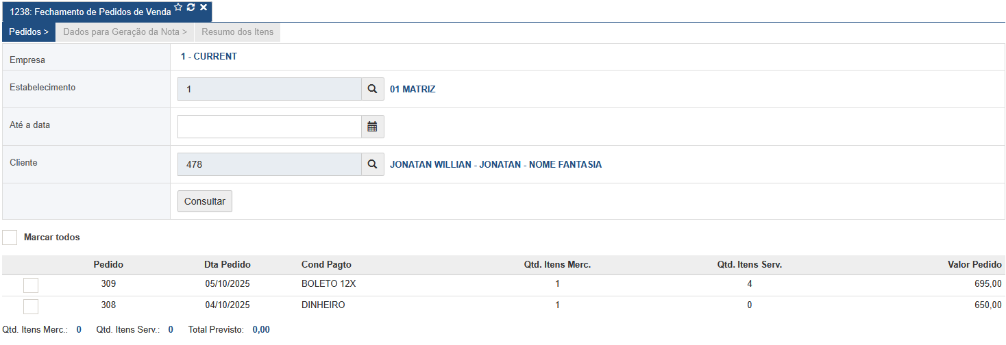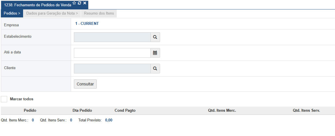 Para realizar a geração de uma nota fiscal de um pedido de venda, deve-se acessar a rotina 1238 [Fechamento de Pedidos]. Isso pode ser feito de duas formas: