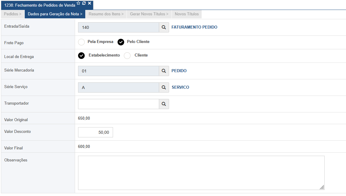 Caso um valor de desconto seja informado, ele será lançado nos itens e apresentado nas notas geradas.