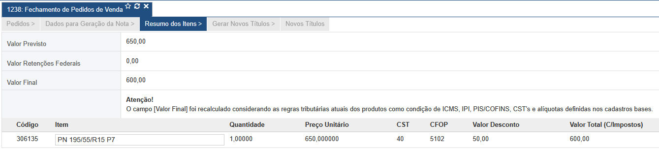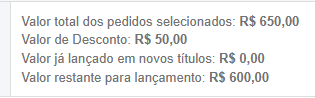A tela exibe um resumo financeiro da operação, onde são apresentados os valores dos pedidos selecionados, os valores de descontos, os valores dos novos títulos já lançados e o valor restante para lançamento, veja: