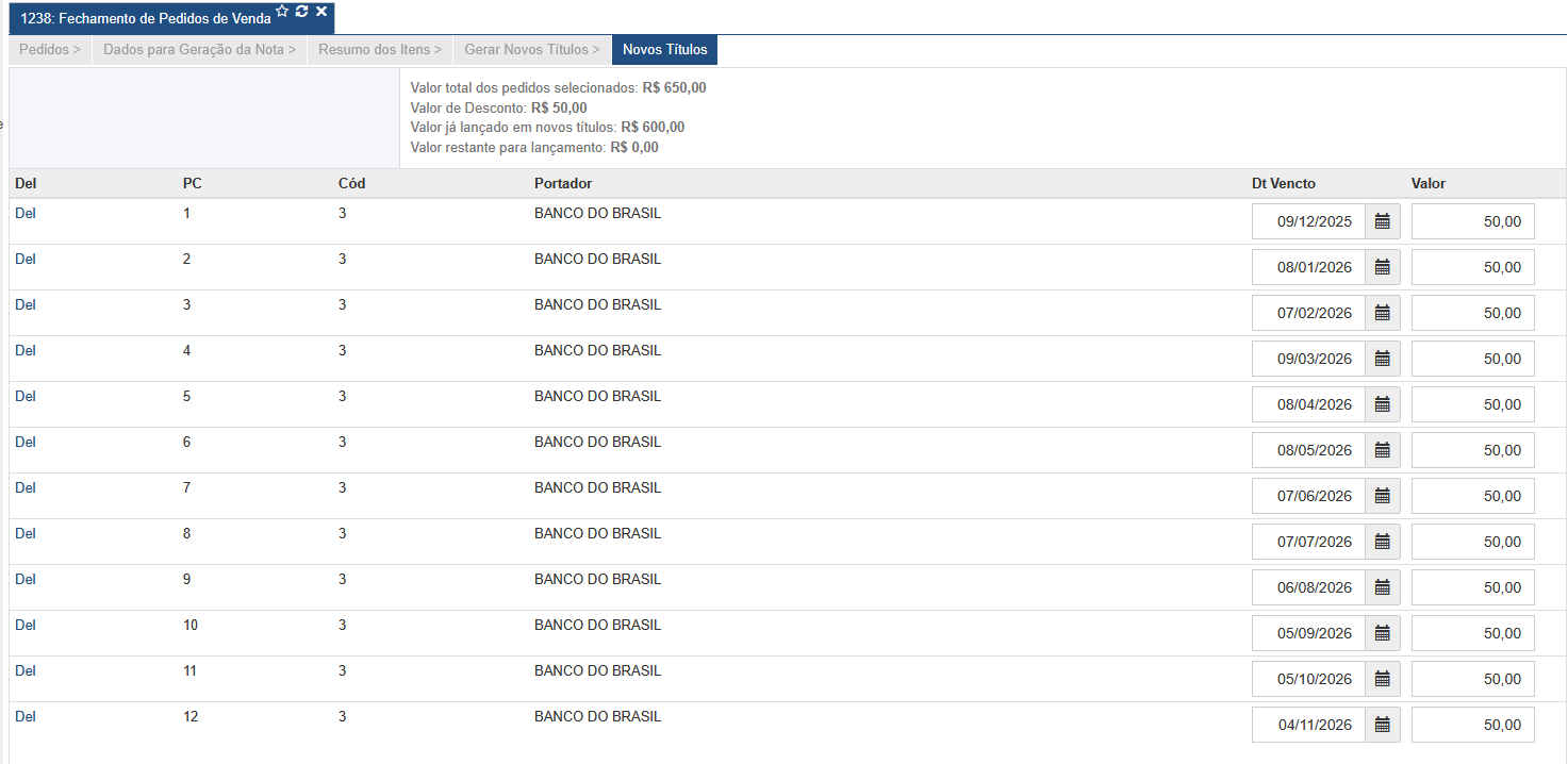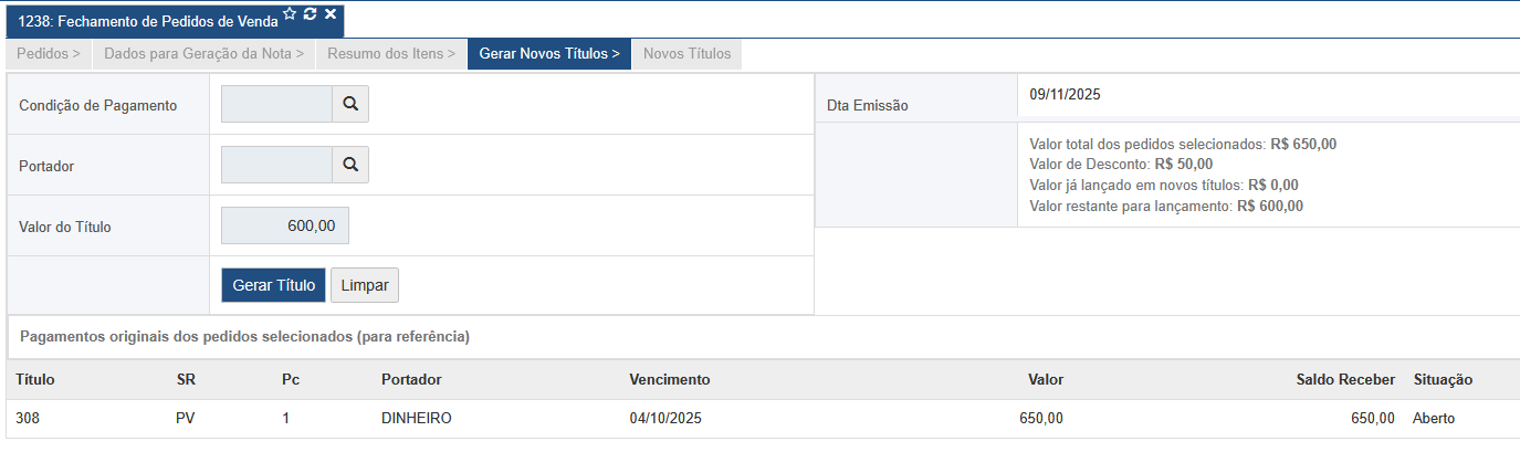 Os títulos originais dos pedidos são apresentados também apenas para referência do que já poderia ter sido combinado com o cliente. É importante ressaltar que, caso um valor de desconto seja informado, todos os títulos originais precisam estar como "Aberto", sem nenhum recebimento parcial informado.