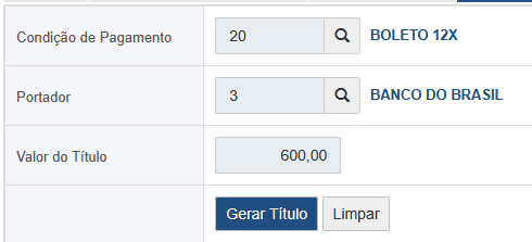 Para gerar novos títulos, basta informar uma Condição de Pagamento, um Portador e o Valor do Título. Note que, se a Condição de Pagamento tiver parcelamento configurado, o Valor do Título informado será dividido no parcelamento máximo de parcelas da condição de pagamento informada, veja um exemplo: