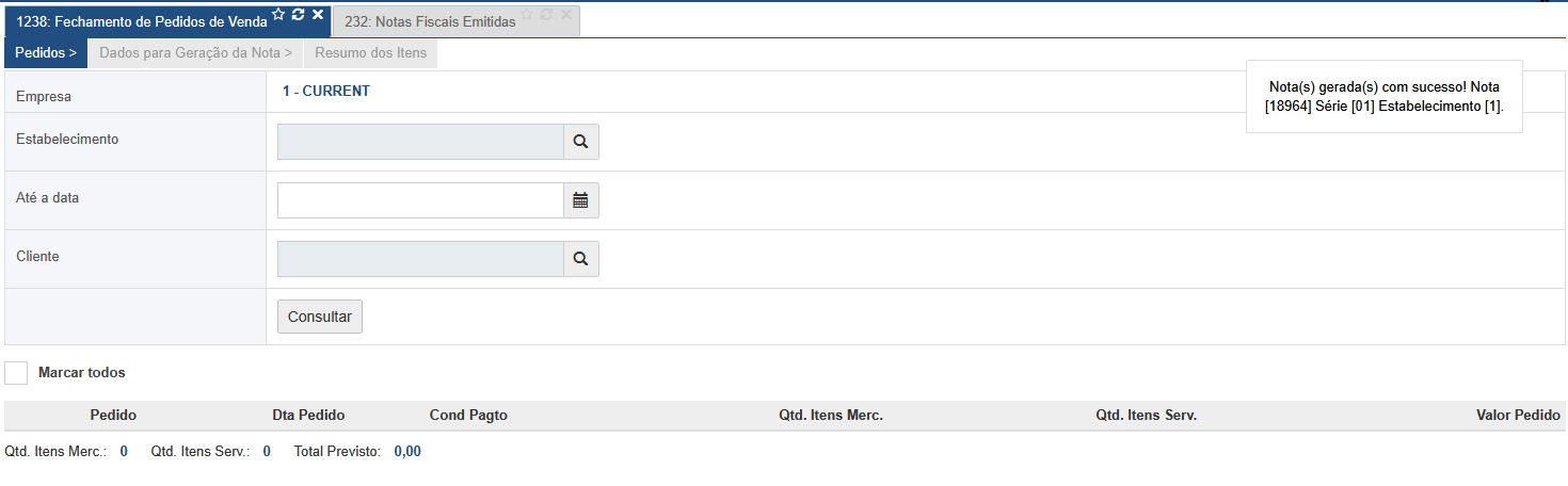 Após o processo completo da rotina, as notas fiscais geradas ficam disponíveis na rotina 232 [Notas Fiscais Emitidas] e com as mesmas informações que definimos na rotina 1238, além de estarem relacionadas com um orçamento novo que foi gerado com as mesmas informações dos orçamentos dos pedidos de vendas.