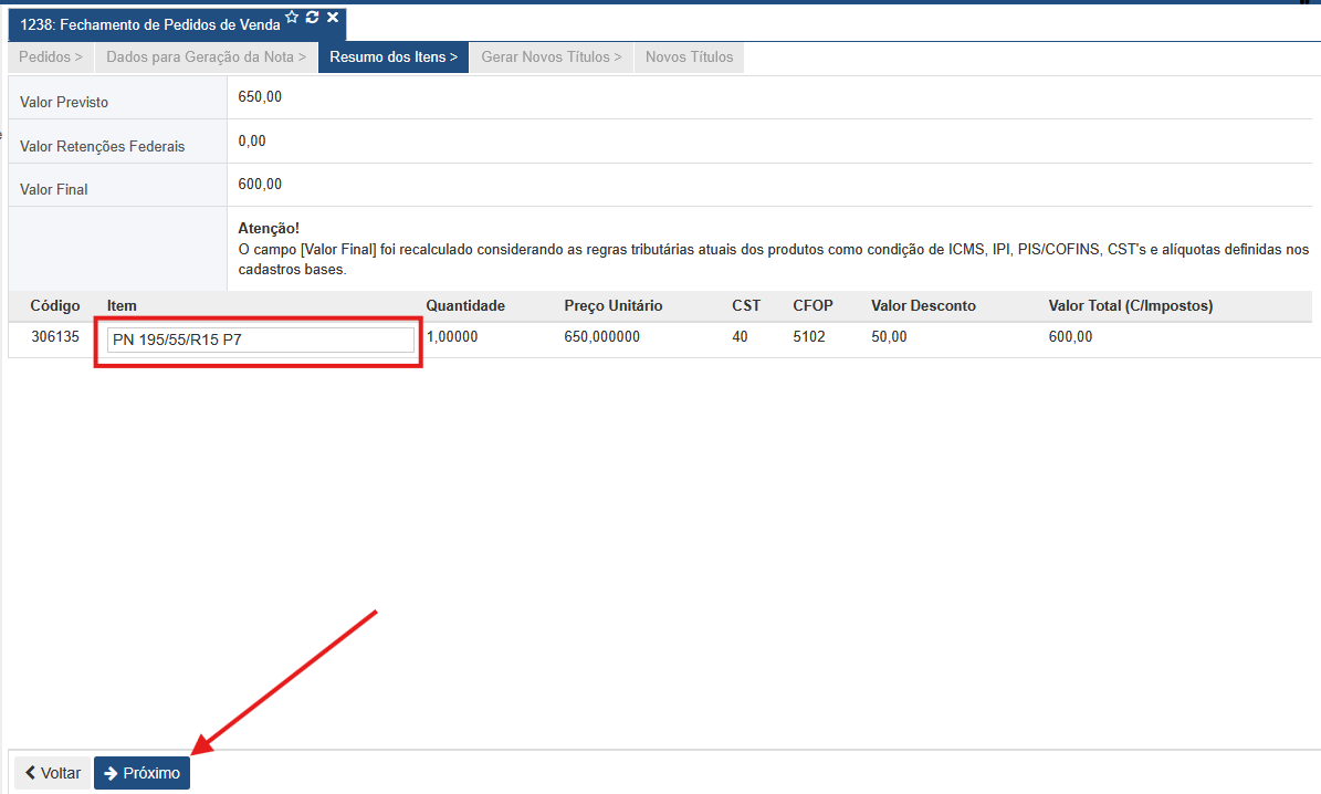 Voltando para o contexto da rotina 1238, ao clicar em [Próximo] será exibida uma tela com todos os itens referentes aos pedidos de venda selecionados na tela anterior, sendo possível fazer a edição das descrições dos itens, caso necessário. A tela de itens também demonstra o desconto aplicado.
