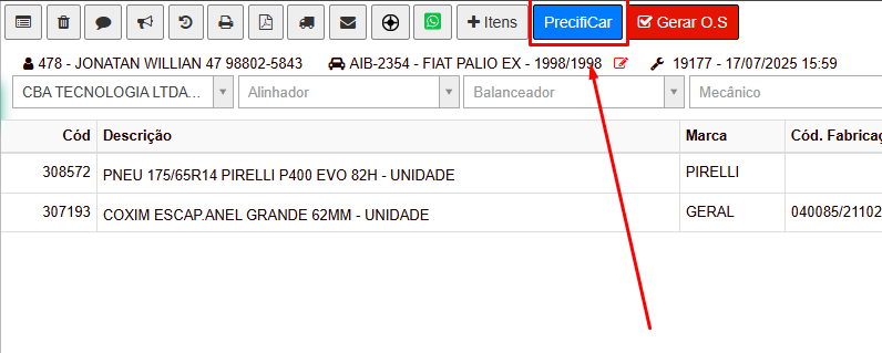 Caso o parâmetro P1399 esteja habilitado para o estabelecimento atual será possível visualizar o botão "PrecifiCar" na tela de O.S / Cotação: