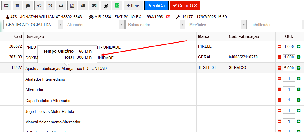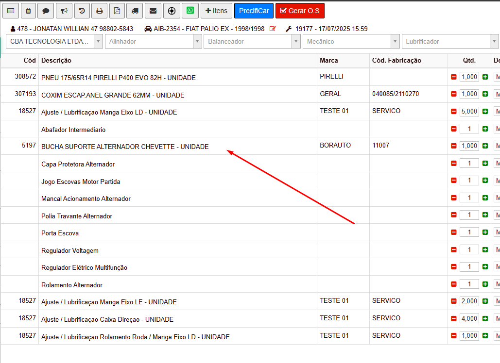 Caso o serviço possua peças relacionadas as mesmas serão inseridas como item sugeridos, ou seja, itens que podem ser substituídos por itens reais do seu catálogo.