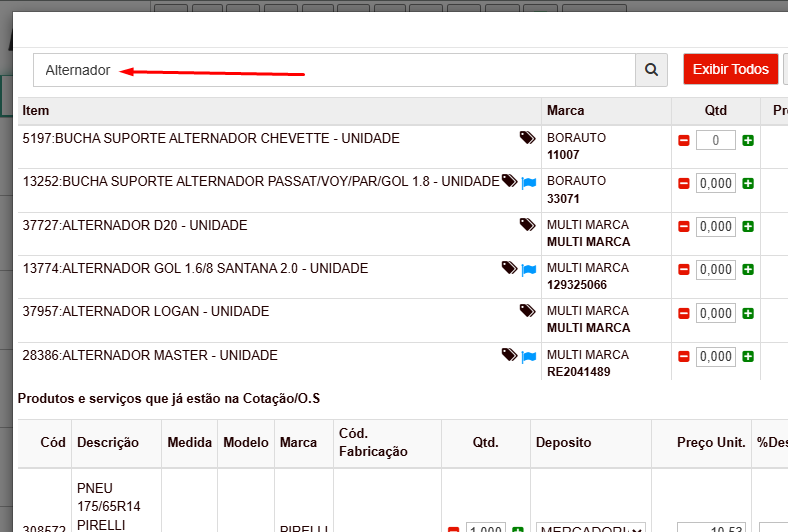 Para substituir a peça sugerida por uma real do seu catálogo basta seleciona-la com clique do mouse. A tela de consulta de itens buscando pelo nome da peça selecionado será exibida.