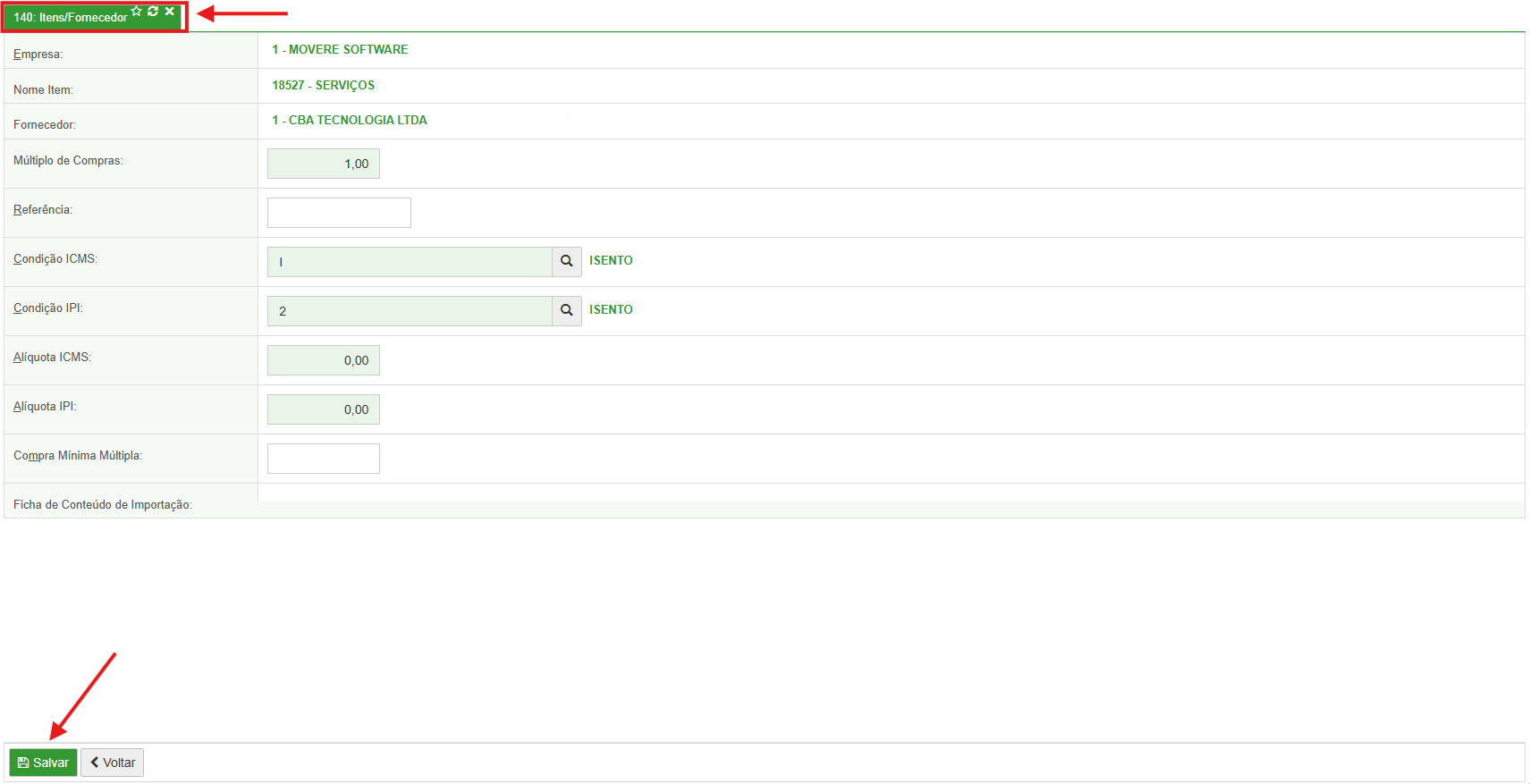 Para que o item seja configurado corretamente, é necessário criar um registro na rotina R140. Essa configuração tem como objetivo principal vincular um fornecedor ao item, além de permitir o cadastro de informações complementares, como impostos, taxas aplicáveis e a quantidade mínima de compra múltiplos, conforme demonstra imagem abaixo: