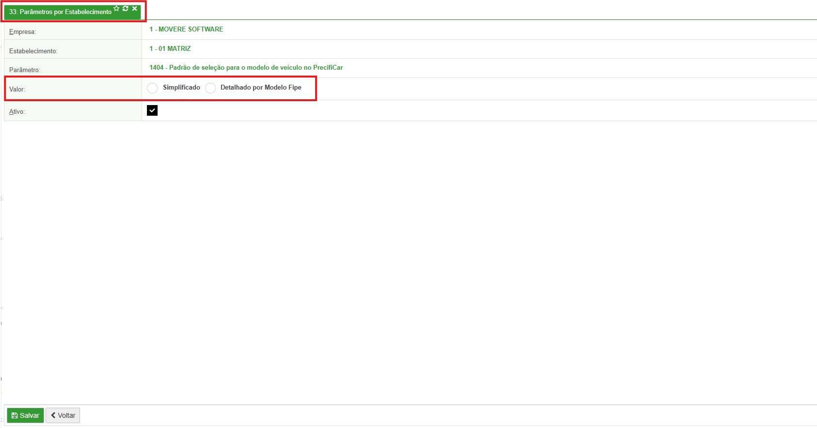 Para isso, foi disponibilizado o parâmetro por estabelecimento [P1404 – Padrão de Seleção para o Modelo de Veículo no PrecifiCar], que define como o sistema irá identificar o modelo do veículo para a realização das consultas no PrecifiCar.