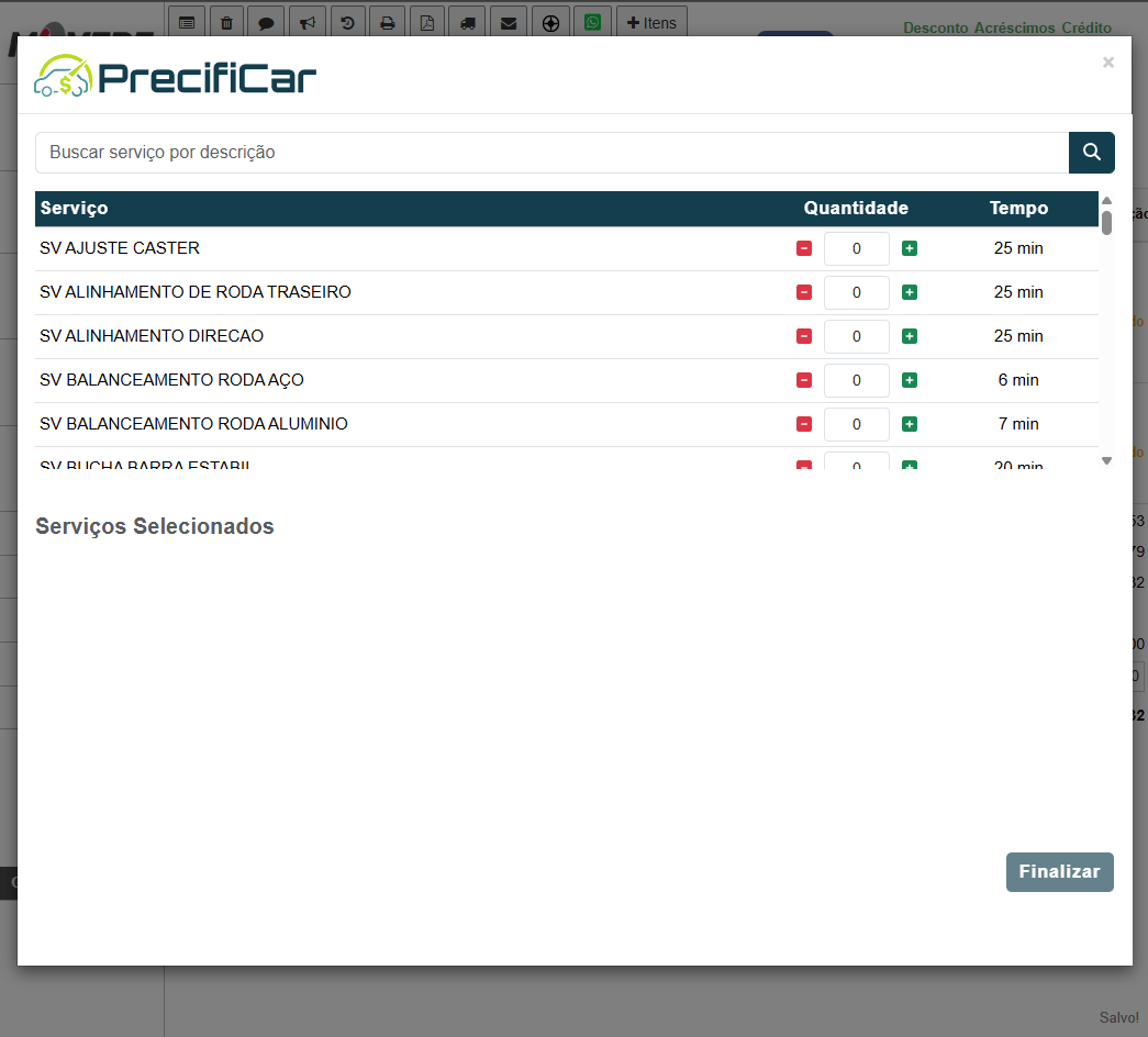 Após clicar em Continuar, será exibida a tela de seleção de serviços do PrecifiCar. O sistema executará automaticamente a pesquisa inicial e apresentará todos os serviços disponíveis para o modelo de veículo previamente selecionado.