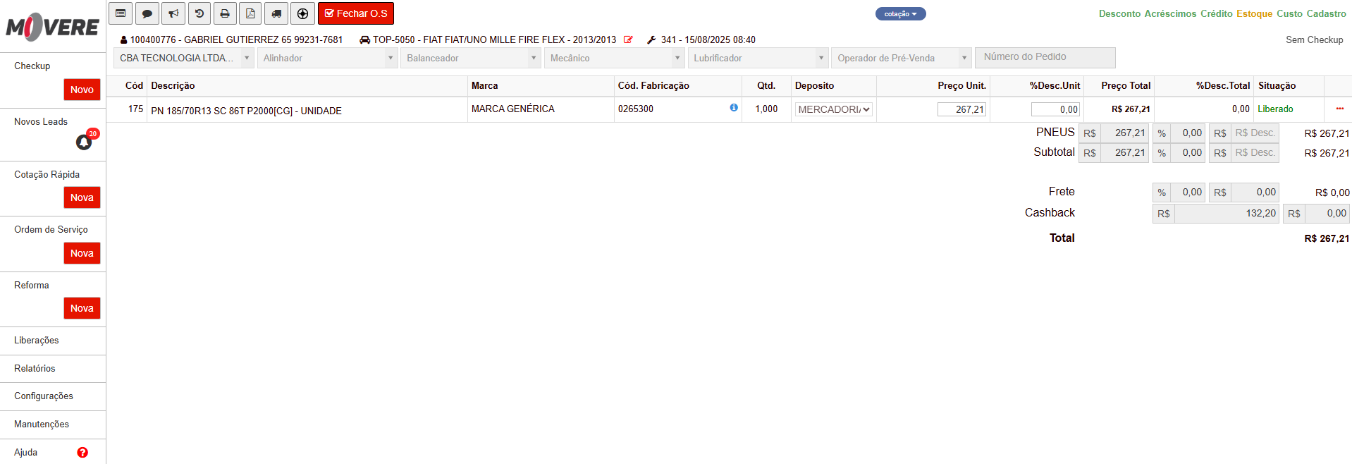 Nesse modo, ao informar a placa do veículo em uma cotação ou ordem de serviço, o sistema identifica automaticamente o modelo FIPE com maior correspondência e realiza a consulta de serviços com base nesse modelo, agilizando o processo.