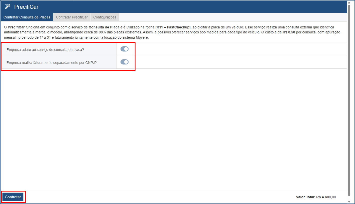 Caso o contrário, será exibido o botão [Contratar], junto com as opções [Empresa adere ao serviço de consulta de placa?] e [Empresa realiza faturamento separadamente por CNPJ?]. Essas opções já vêm marcadas por padrão para facilitar a finalização da contratação.