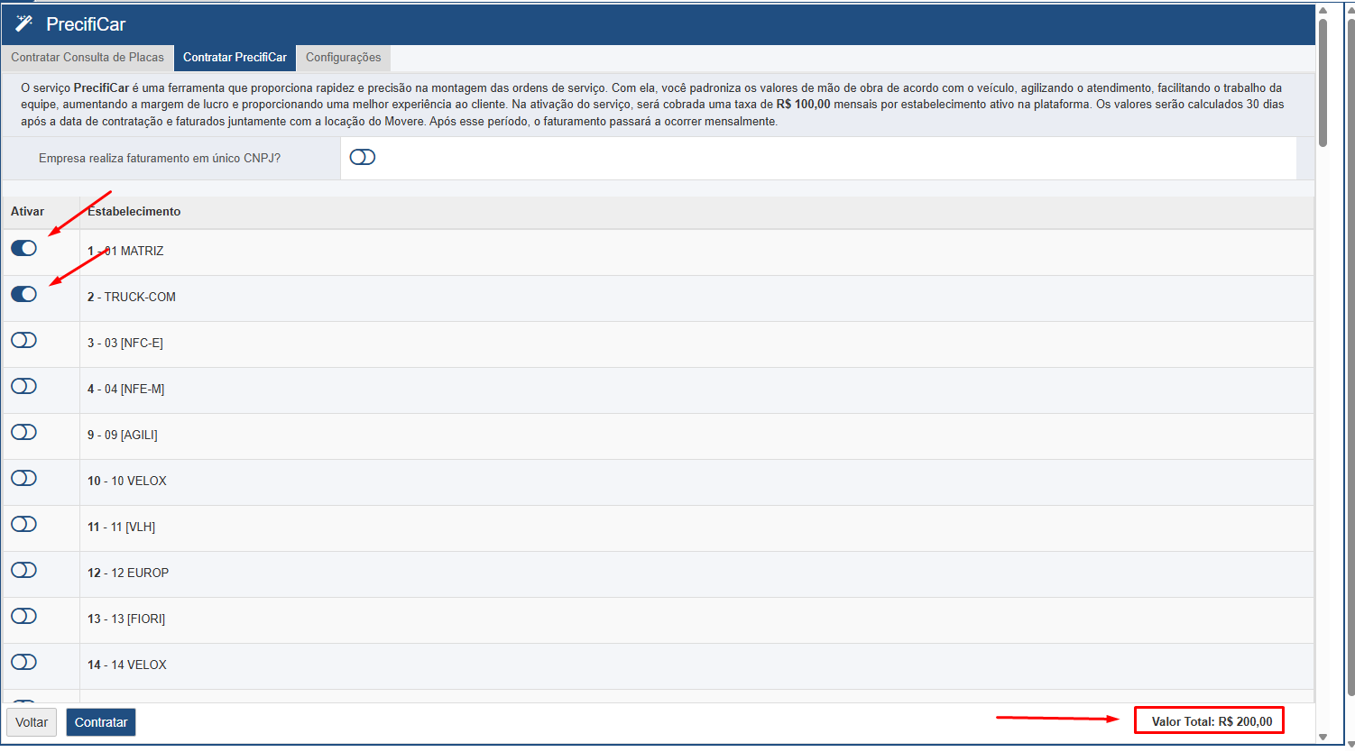 Prosseguindo para aba [Contratar PrecifiCar], o faturamento é realizado por múltiplos estabelecimentos. Nesse modelo, o sistema considera que a cobrança será feita individualmente para cada estabelecimento ativo selecionado. :