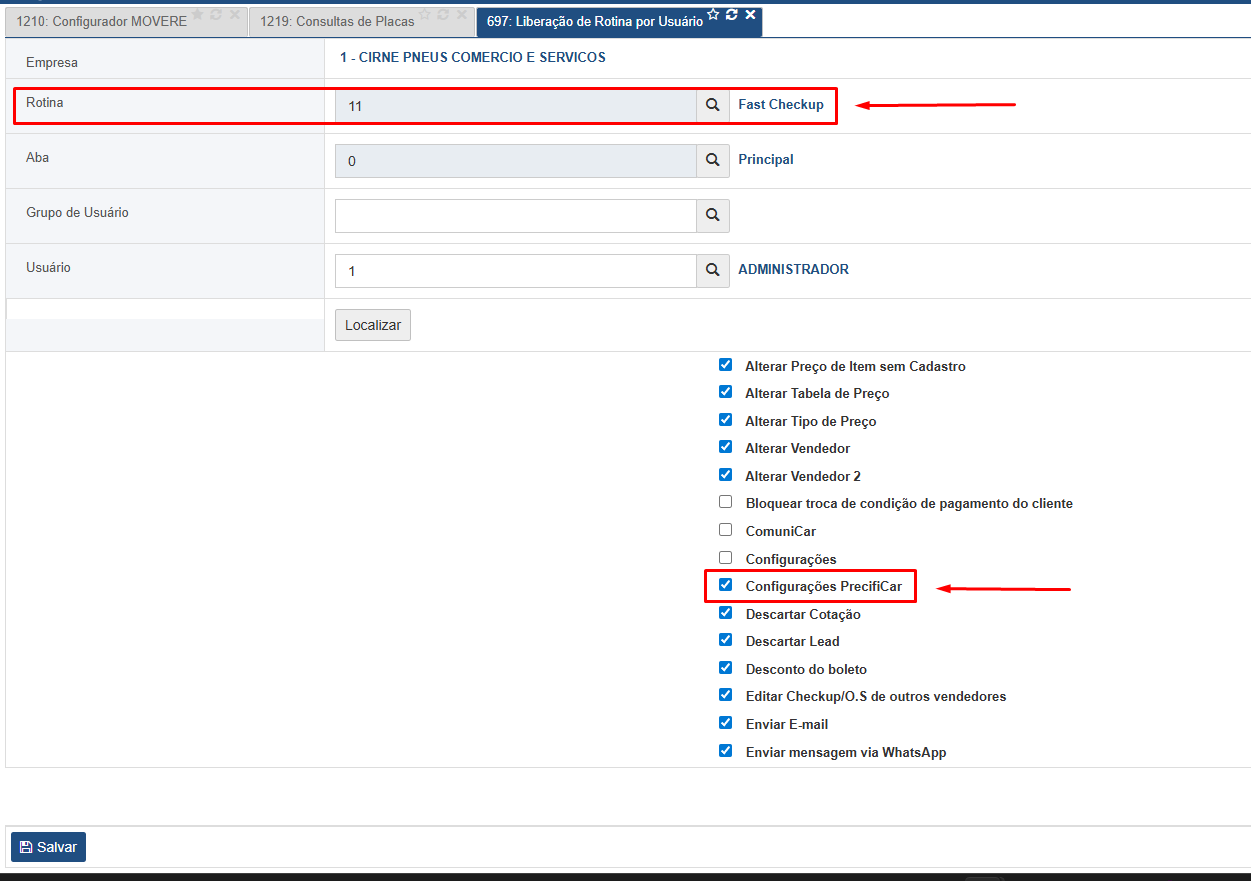 O direito [Configurações PrecifiCar] da [R11 - Fast Checkup] é responsável por habilitar a visualização da aba PrecifiCar no menu Configurações da R11.