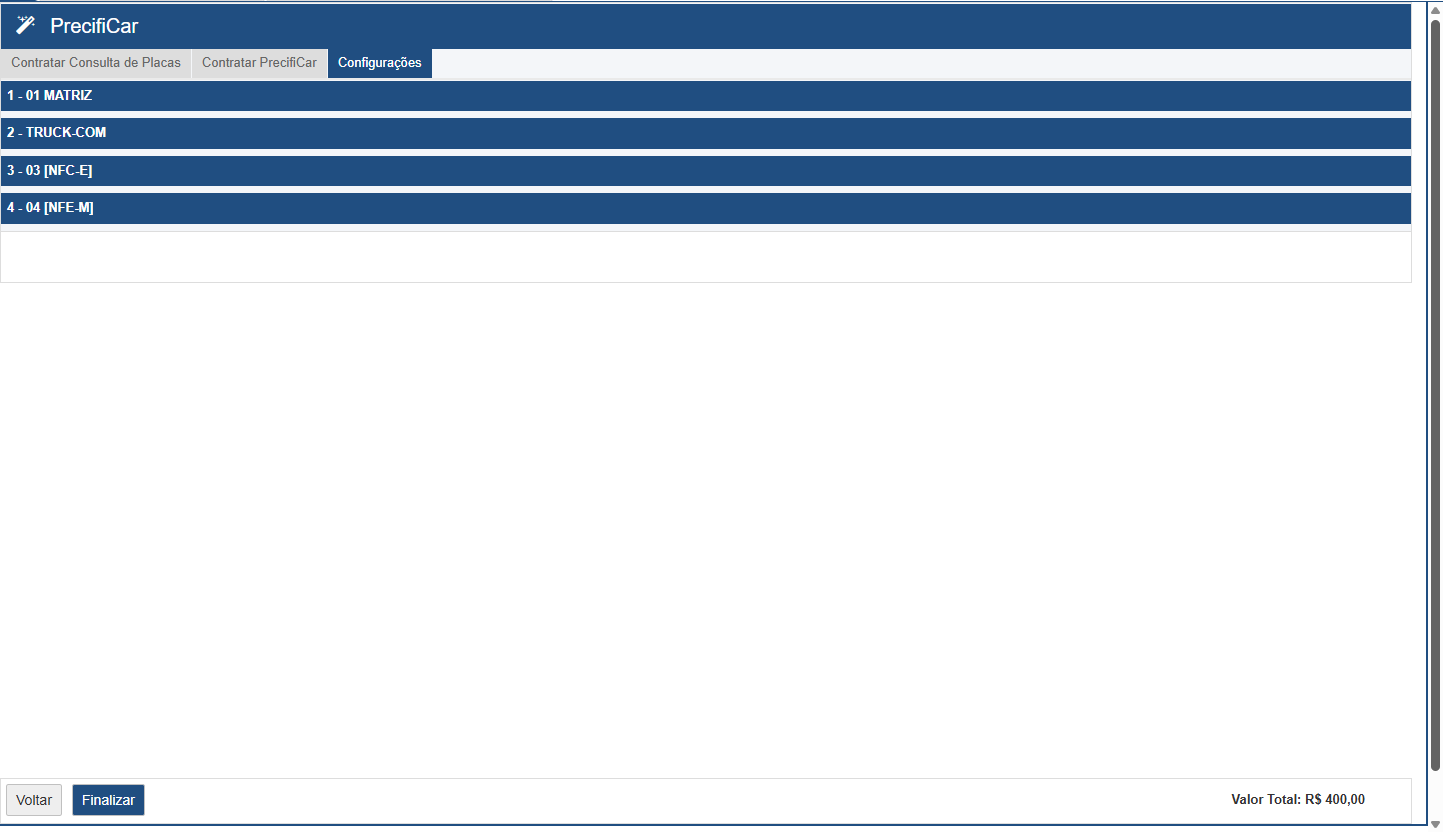 Por fim, na aba [Configurações], serão exibidos todos as configurações do PrecifiCar referente a cada estabelecimento contratado.