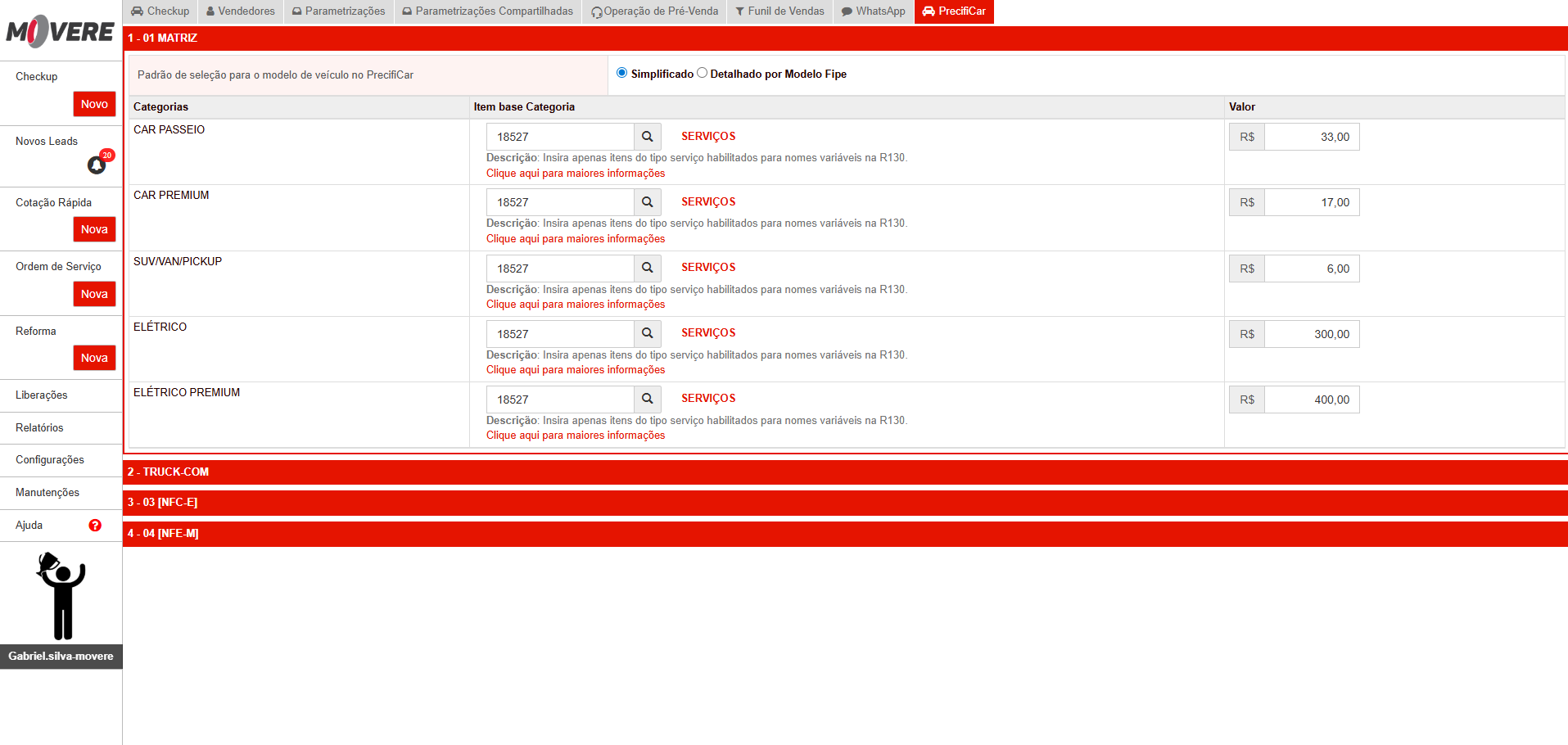 Esta documentação tem por intuito iterar a respeito da usabilidade e configurações para utilização da ferramenta de precificação de serviços disponível no MOVERE, PrecifiCar.