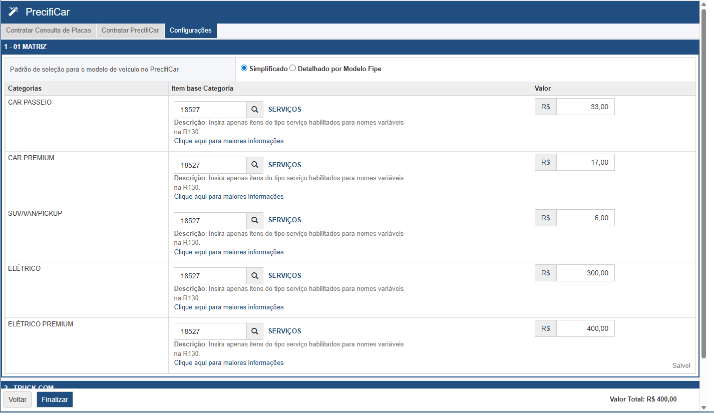Após a ativação do direito [Configurações PrecifiCar], a aba [PrecifiCar] ficará disponível dentro do menu Configurações da rotina [R11 – Fast Checkup]. Nessa aba, será possível definir um item base para cada categoria, atribuindo valores específicos de acordo com as categorias disponíveis no sistema.