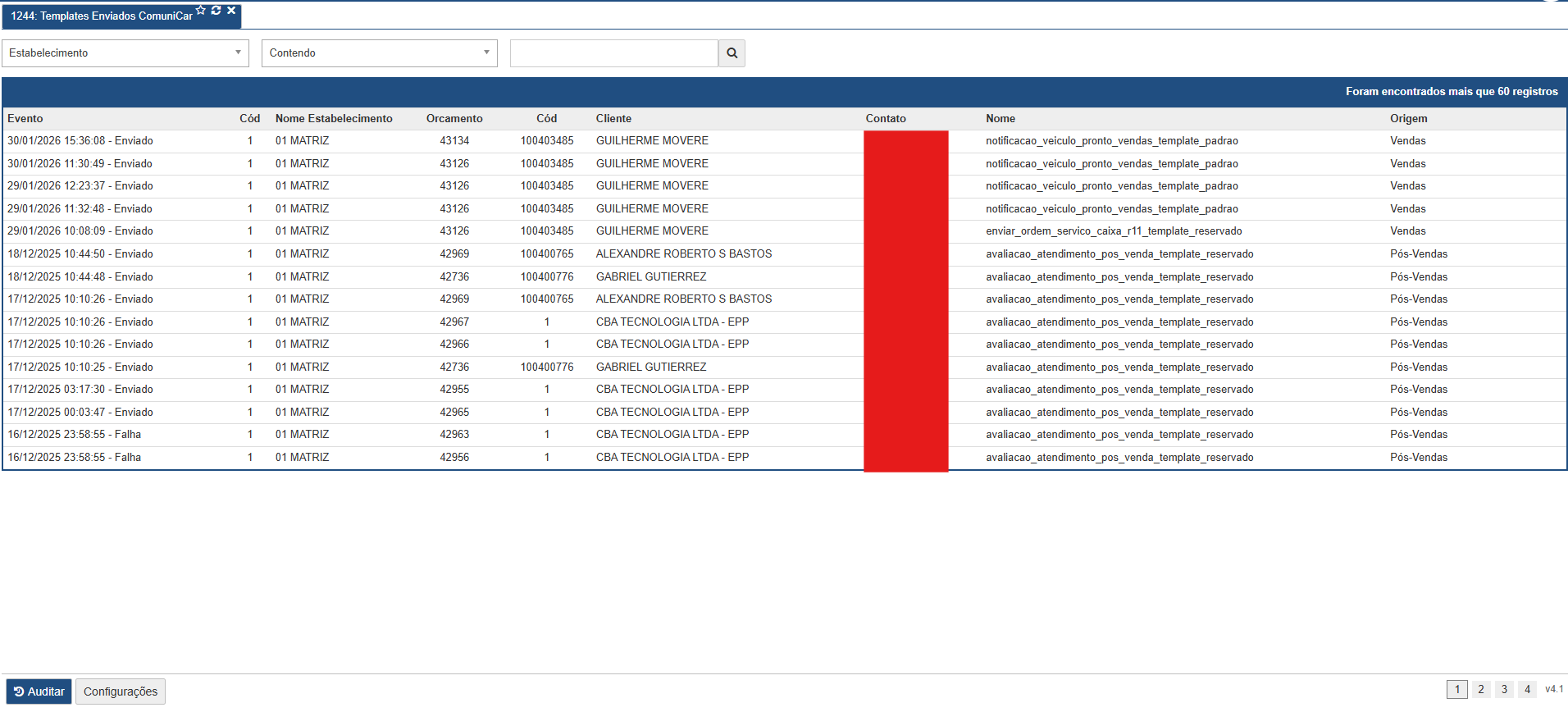 Na rotina [R1244 - Templates Enviados ComuniCar] é possível acompanhar os templates para envio do ComuniCar.