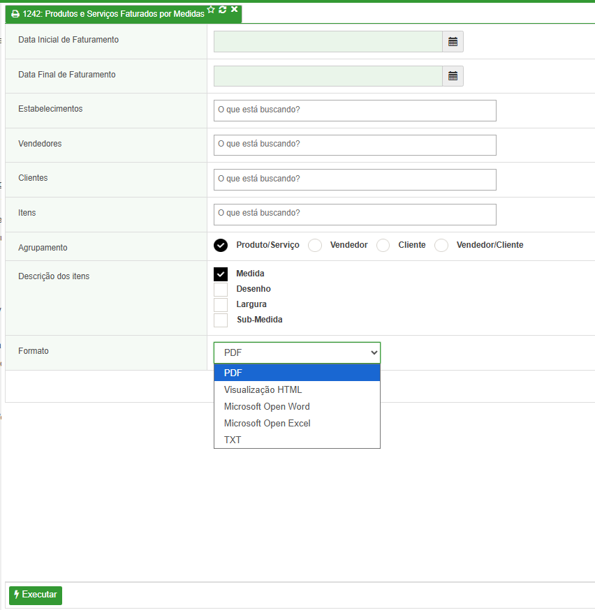 OBS: Os campos "Estabelecimentos", "Vendedores", "Clientes" e "Itens" permitem pesquisa com múltiplas informações.