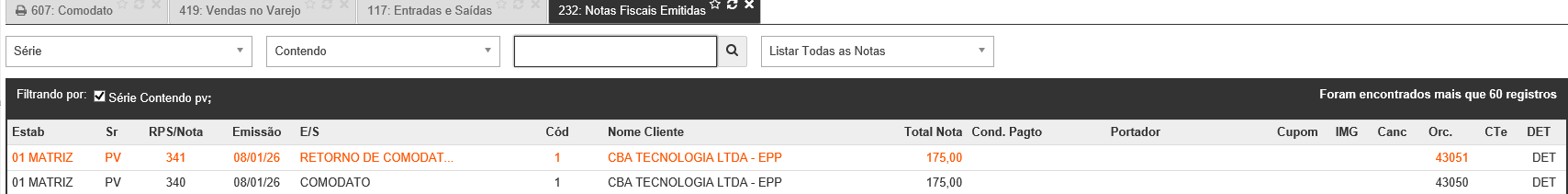 Durante a pesquisa, o sistema considera apenas notas fiscais de saída do tipo Comodato.