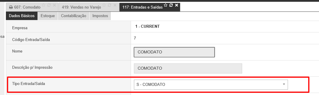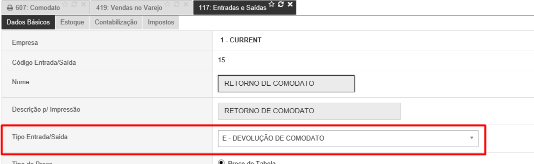 Use uma entrada e saída utilizando o tipo Devolução de Comodato.
