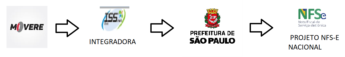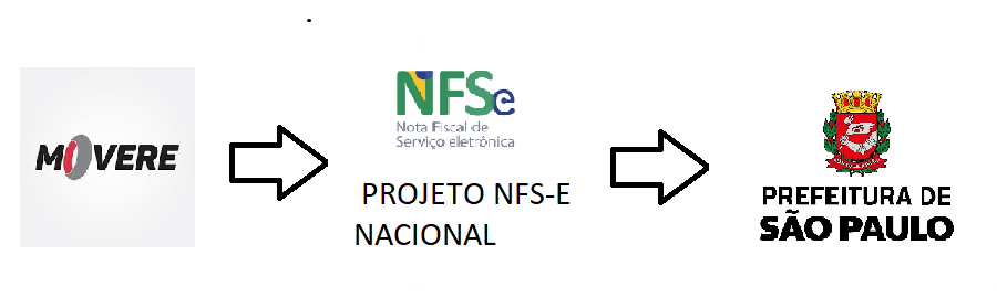 Fluxo descrito: Movere envia as informações para a integradora, que as repassa ao município, que por final ao governo (base de dados do projeto NFS-e Nacional).