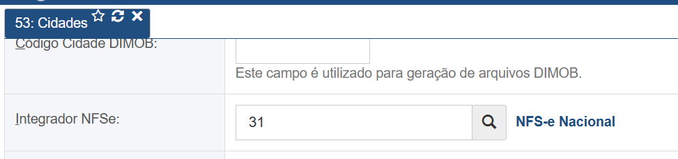 Procure pelo seguinte campo "Integrador NFSe:" ele deve ser preenchido com o código 31, indicando o NFS-e Nacional como integrador para emissão de notas de serviço.