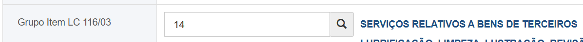 | 14 | 03 | 00 | Recondicionamento de motores (exceto peças e partes empregadas, que ficam sujeitas ao ICMS). | |