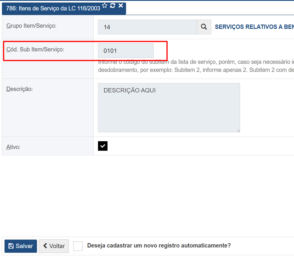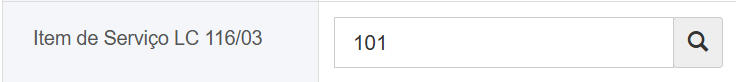 Informe em Grupo Item/Serviço, o 'Item' relacionado, no nosso exemplo foi informado 14, e posteriormente o Sub-Item + Desmembramento, conforme abaixo "0101"