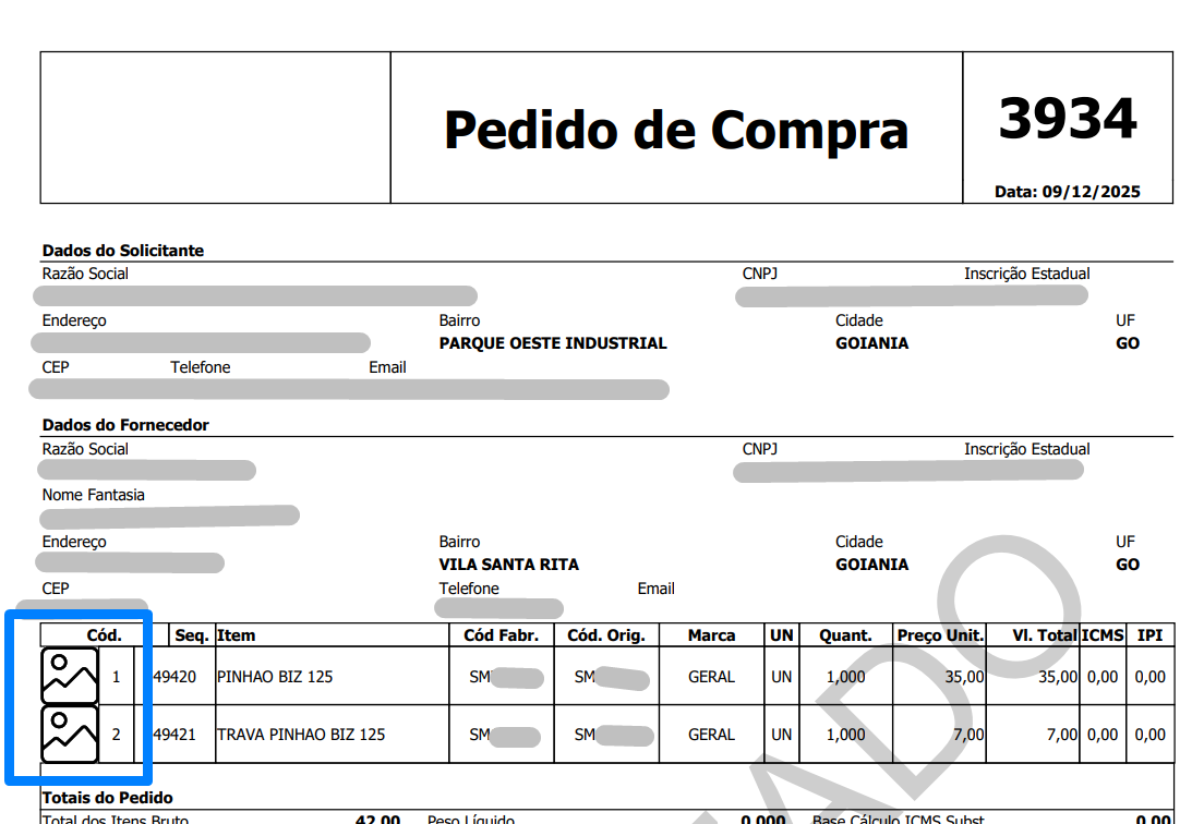 Quando o parâmetro P1422 estiver ativado, o sistema passa a exibir a imagem do item ao lado do código nas impressões de Orçamento e Pedido de Compra.